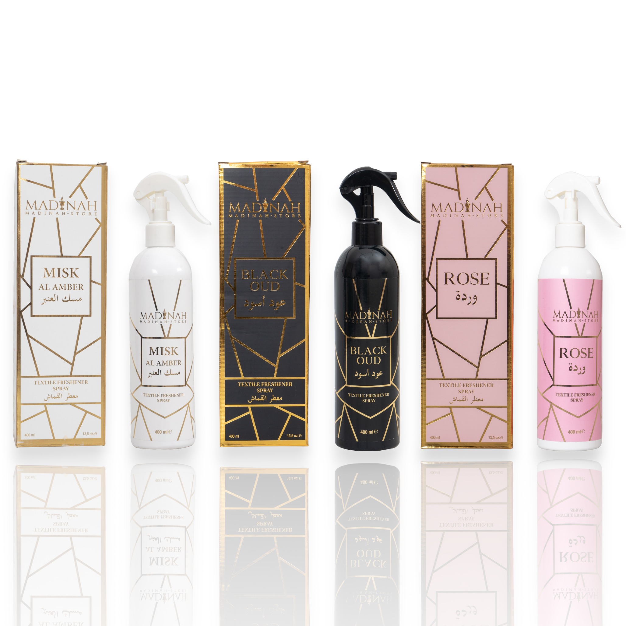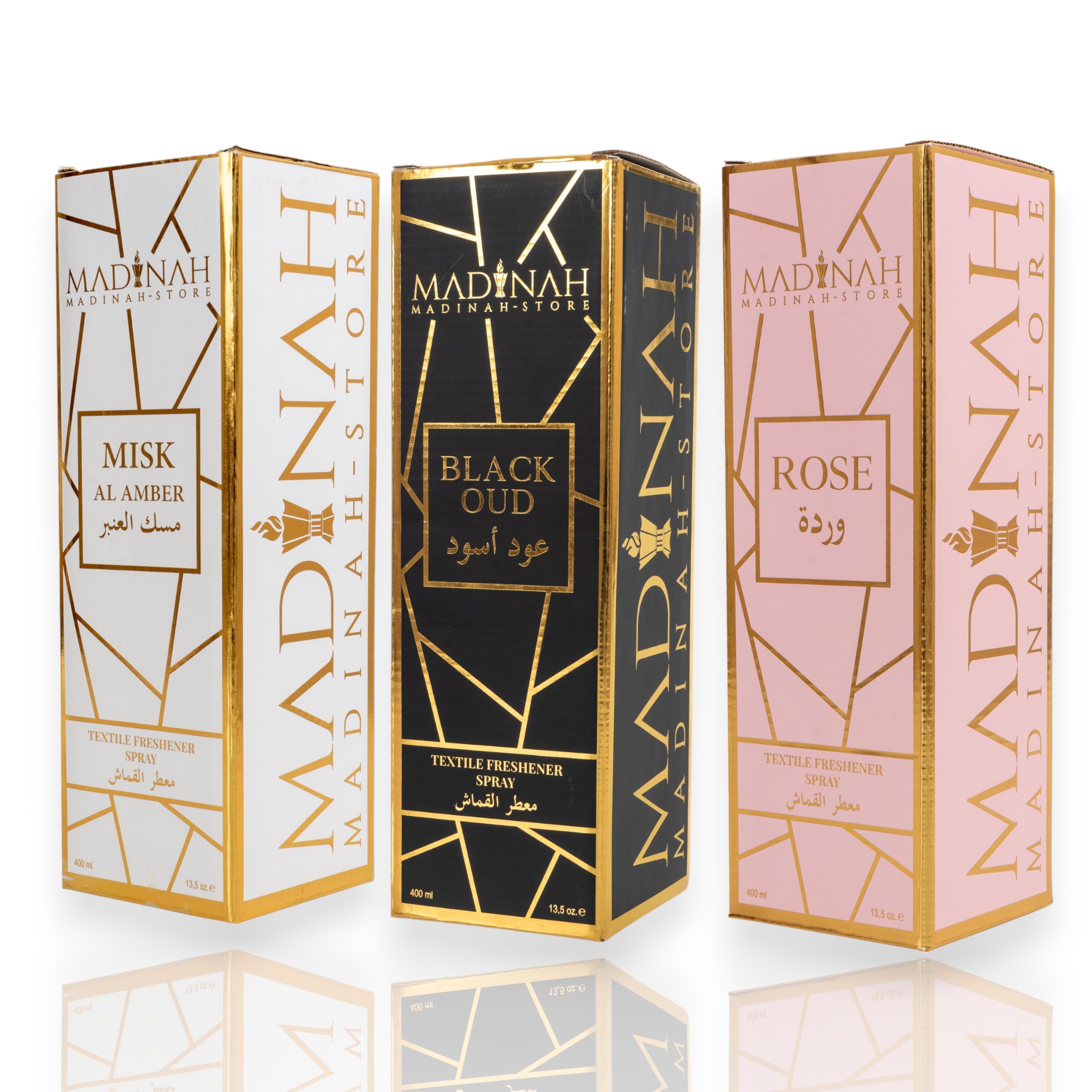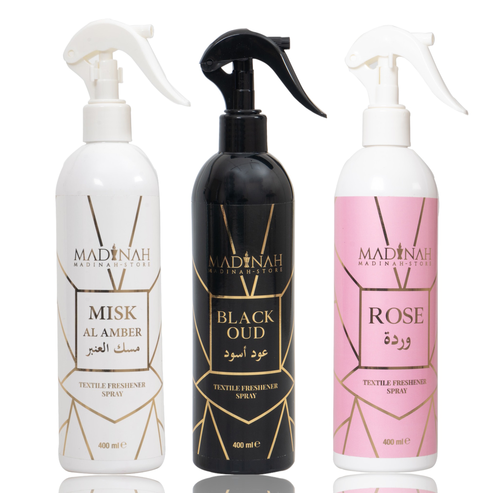 3er Set Textilerfrischer & Raumduft – Misk Al Amber + Black Oud + Rose